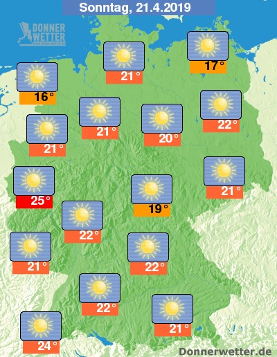 Am heutigen Ostersonntag erwartet uns wiederum ein verbreitet sonniger Tag, nur im Südwesten ziehen gebietsweise auch mal einige Wolken durch, es bleibt aber im gesamten Land trocken. Die Temperatur steigt auf sehr milde 17 Grad auf Langeroog und bis auf sommerliche 25 Grad in Bonn.