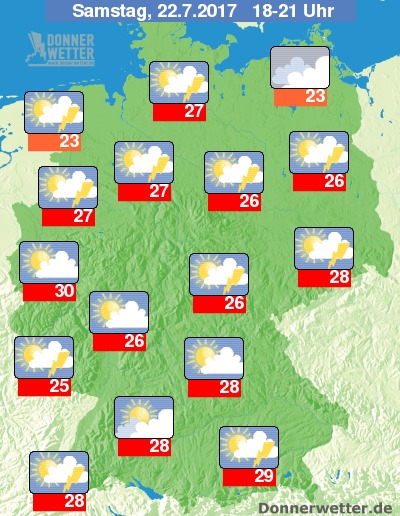 Heute Abend zeigt sich vor allem der Süden heiter, aber auch sonst ist es vielerorts heiter, jedoch können auch dichte Wolken durchziehen, die für Schauer und Gewitter sorgen. Die Temperatur liegt bei 23 Grad an den Küsten und um 30 Grad in Köln.