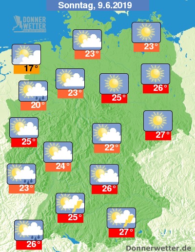 Heute ist es zunächst verbreitet noch heiter bis sonnig, von Westen her nimmt die Bewölkung jedoch im Tagesverlauf immer weiter zu und gegen Abend bilden sich über der Westhälfte des Landes gebietsweise Schauer und Gewitter. Im übrigen Bundesgebiet bleibt es dagegen trocken und meist auch noch locker bewölkt. Die Temperatur steigt auf teils nur 17 Grad an der Nordseeküste und bis 27 Grad in Oberbayern.