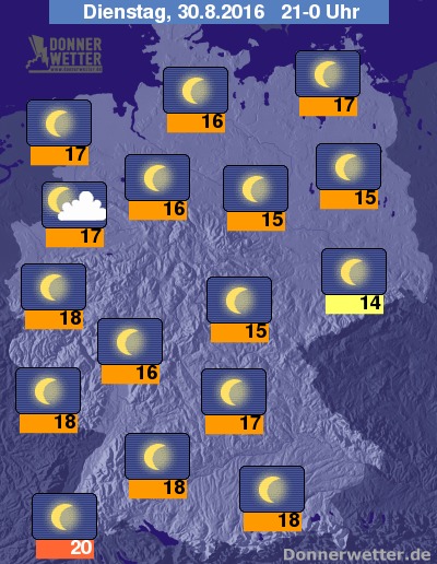 Die Temperaturen liegen am Abend bei Werten um 21 Grad C in Ostfriesland und um 25 Grad C am Oberrhein.