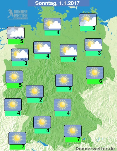 Am heutigen Neujahrstag scheint von der breiten Landesmitte bis in den Süden Deutschlands verbreitet die Sonne bei höchstens lockerer Bewölkung. Mehr und zunehmend auch dichte Wolken ziehen über den Norden und Nordwesten des Landes hinweg. Vom Niederrhein bis nach Schleswig-Holstein kann es zum Abend hin auch regnen, im übrigen Bundesgebiet bleibt es weitgehend trocken. Die Temperatur steigt auf 2 Grad am Westerwald und bis 7 Grad im Breisgau.