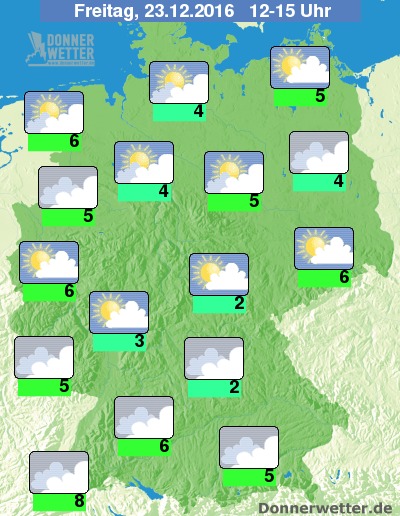 Dabei liegen die Höchstwerte zwischen 2 Grad im Thüringer Bergland und 8 Grad am Oberrhein.