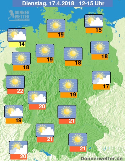 Heute Nachmittag ist es verbreitet heiter oder sonnig, im Südwesten sind hier und da einige Wolken möglich, dabei bleibt es aber trocken. Die Temperatur liegt bei 14 Grad in Cuxhaven und bis 22 Grad in Bonn.