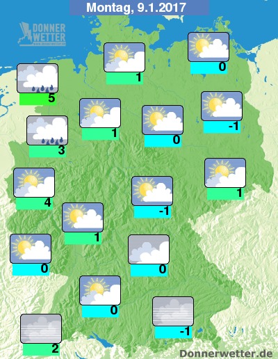 Heute ist es zunächst meist locker bis aufgelockert, im Südosten weitgehend stark bewölkt oder neblig-trüb, dabei jedoch trocken. Gegen späten Nachmittag und Abend zieht im Nordwesten ein Tiefausläufer mit Regen herein. Die Temperatur steigt auf -1 Grad im südlichen Brandenburg und bis auf 5 Grad am Dollart.