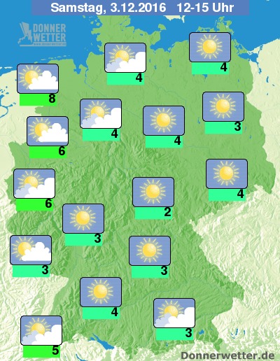 Heute Nachmittag scheint verbreitet die Sonne bei einem teils leicht bewölktem und oft auch wolkenlosem Himmel. Gebietsweise mehr, jedoch weitgehend aufgelockerte Wolken ziehen über den Norden und den Alpenrand hinweg. Es bleibt landesweit trocken. Die Temperatur steigt auf 2 Grad im Grabfeld und bis 8 Grad an der Ems.