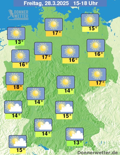 Am Freitagnachmittag ist es über weiten Teilen des Landes sonnig; südlich der Donau kann am Nachmittag zeitweise auch mal harmlose Bewölkung durchziehen. Es bleibt niederschlagsfrei.