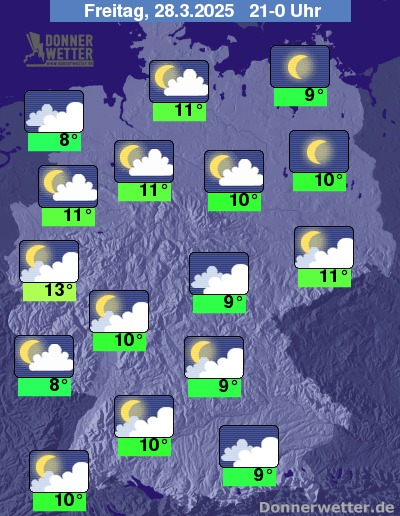 In der Nacht zum Samstag nimmt die Bewölkung von Norden her zu, bis in die frühen Morgenstunden breiten sich dichte Wolken dann auch über die Mitte bis an den Alpenrand aus. Im Westen und Nordwesten sowie in Alpennähe fällt dabei etwas Regen, sonst bleibt es meist trocken.