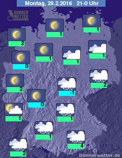 Heute Abend fällt im Süden, im südlichen Thüringen und in Sachsen immer wieder Schnee, zum Teil auch Regen, es besteht erhöhte Glättegefahr! Weiter nach Nordwesten hin zeigt sich der Himmel hingegen über weite Teile des Landes sternenklar, hier bleibt es trocken. Die Abendtemperatur liegt bei 4 Grad in Rosenheim und etwa 0 Grad im Münsterland.
