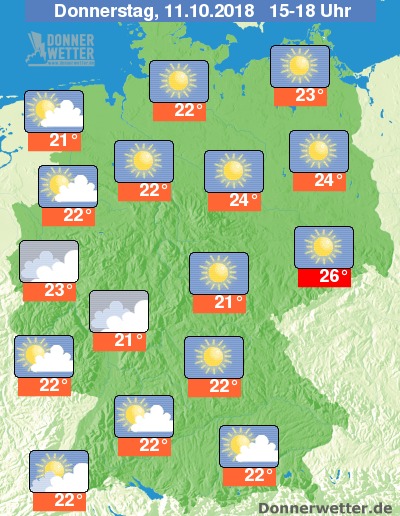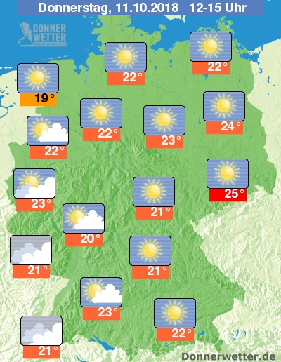Im Verlaufe des Nachmittags dringen die dichteren Wolken bis in die Kölner Bucht und ins Rhein Main Gebiet vor, dahinter setzt sich aber die Sonne wieder öfters in Szene. Im übrigen Land bleibt es bei blauem Himmel und reichlich Sonnenschein. Mit den Temperaturen geht es allgemein noch etwas aufwärts. Dank leichten Föhneinflusses des Erzgebirges können in Teilen Sachsens und in der Lausitz auch 25 Grad überschritten werden.