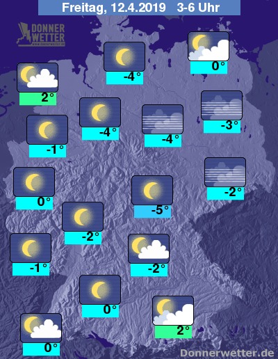 Die Luft kühlt bis zu den Frühstunden in den kalten Spätwinterbereich ab. Verbreitet gibt es Frost zwischen -5 und 0 Grad. Unter den dichteren Wolken im Chiemgau, sowie im Emsland bleibt es etwas milder.