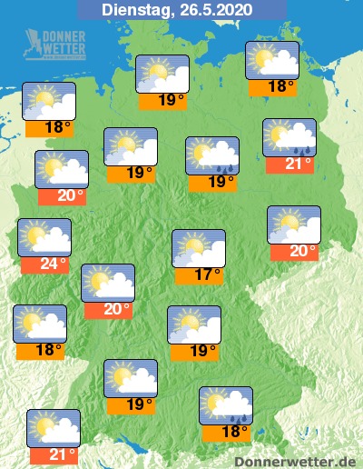 Die Höchstwerte liegen allgemein zwischen 16 und 25 Grad, wobei die höheren Werte eher im Westen erreicht werden.