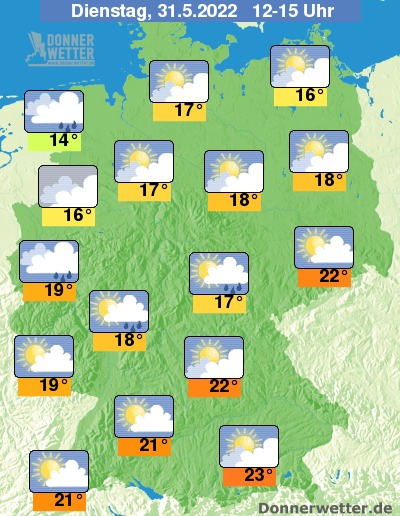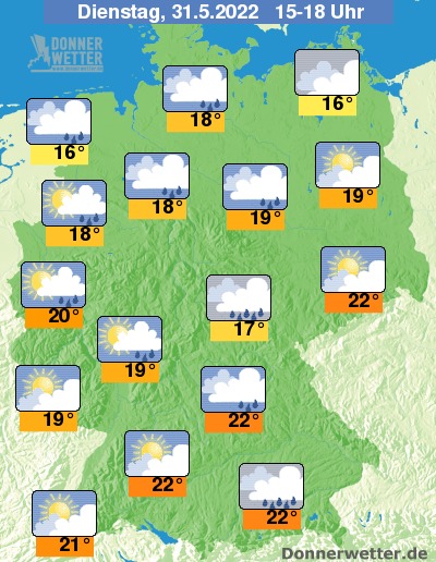 Am Dienstagnachmittag zeigt sich der Himmel über weiten Landesteilen teils wechselnd bis aufgelockert, teils stark bewölkt. Heitere Phasen beschränken sich zeitweise auf die West- und Südwesthälfte. Hier sowie entlang der Oder bleibt es dabei meist trocken, sonst muss lokal mit Schauern, am Alpenrand, der Mitte und im Nordwesten auch mit einzelnen Gewittern gerechnet werden.