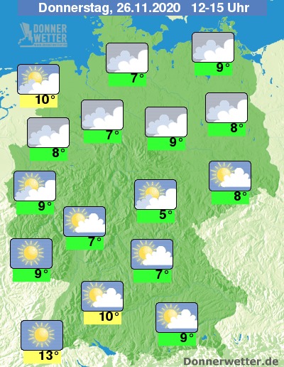 Am frühen Nachmittag halten sich in Norddeutschland häufig dichtere Wolken aus denen es stellenweise etwas tröpfeln oder nieseln kann. In der Mitte und im Süden gibt es eine Mischung aus teils dichtem Nebel oder Hochnebel und regionalem Sonnenschein.