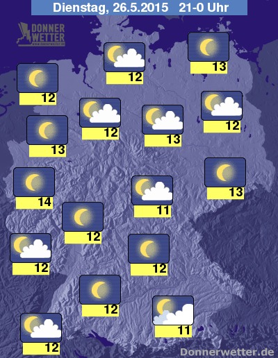 Heute Abend klart der Himmel über Deutschland verbreitet auf, gebietsweise ziehen aber auch noch einige Wolken durch, dazu bleibt es aber schon weitgehend trocken. Die Abendtemperatur liegt bei 14 Grad in Aachen und etwa 11 Grad im Vogtland.