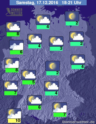 Heute Abend zieht meist nur lockere, hier und da auch noch aufgelockerte Bewölkung durch, vor allem im Nordwesten halten sich aber auch oft dichte Wolken, die jedoch kaum Regen bringen. Die Abendwerte liegen bei 2 bis 10 Grad.