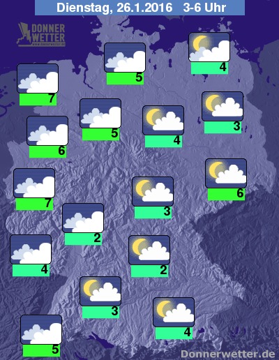 Am Dienstag halten sich über der Nordwesthälfte des Landes meist dichte Wolken und hier und da fällt auch Regen oder Sprühregen, weiter nach Südosten hin ist es zum Teil stark, teils jedoch auch aufgelockert bewölkt und weitgehend trocken. Die Temperatur steigt auf 5 Grad im Vogtland und bis 10 Grad in Bonn. Gegen Abend weht im Nordwesten ein teils stürmischer Wind.
