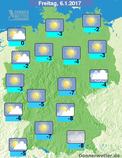 Im Lauf der Nacht hat sich der Himmel fast landesweit aufgeklart, lediglich im Erzgebirge fällt noch etwas Schnee. Dabei bleibt es auch am Tag frostig kalt. Plusgrade werden höchstens in Nordseenähe erreicht. Wo der Nebel sich auch im Tagesverlauf hält, bleibt das Thermometer bei frostigen -8 Grad stehen.