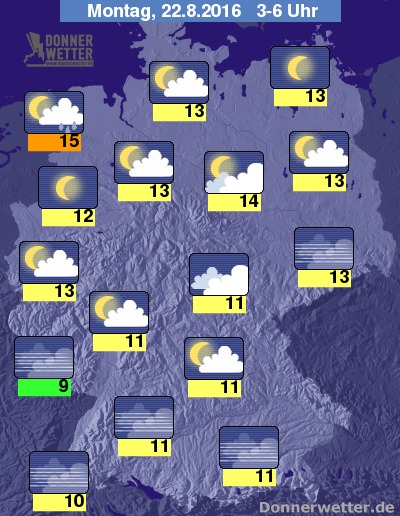 In der Nacht zum Montag ist der Himmel über dem Land überwiegend nur locker bewölkt oder sternenklar, vor allem im Nordseeumfeld und über der breiten Landesmitte können aber auch mal dichte Wolken durchziehen, dabei sind vereinzelte Schauer möglich, sonst bleibt es aber landesweit weitgehend trocken. Die Temperatur sinkt auf 15 Grad an der Nordseeküste und bis 9 GRad im Saargau.