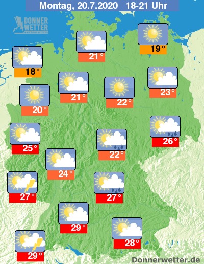 Heute Abend zeigt sich das Wetter größtenteils heiter bis sonnig. Einzelne Schauer und lokale Gewitter können sich bevorzugt noch im Osten und Süden bilden, sie klingen aber auch hier im Verlauf ab. Die Temperatur liegt bei kühlen 18 Grad in Wilhelmshaven und bis 29 Grad in Stuttgart.