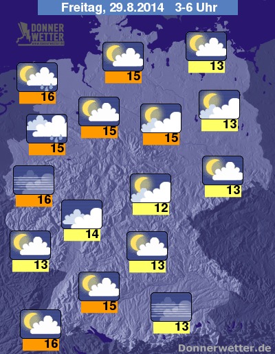 Bis zum frühen Morgen fallen vorzugsweise in der Nordwesthälfte noch einzelne Schauer. In Restdeutschland bleibt es bei wechselnder Bewölkung häufig trocken, vereinzelt kann sich Nebel bilden. Die Temperaturen liegen bei Werten um 16 Grad C im Rheinland und um 12 Grad entlang der Mittelgebirge.