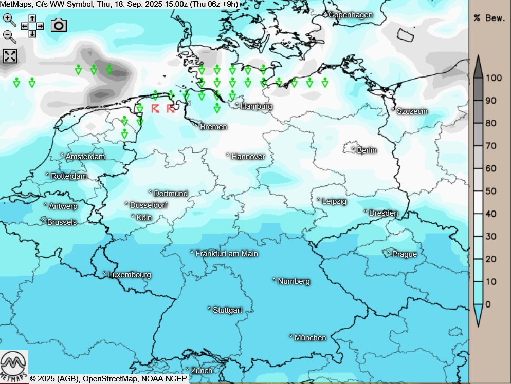 Am Donnerstagnachmittag bleibt der Himmel über dem Norden und Osten wechselnd, teils auch stark bewölkt; dabei muss zeitweise mit etwas Regen oder einzelnen Schauern gerechnet werden. Südlich davon ist es heiter oder sonnig und es bleibt niederschlagsfrei.