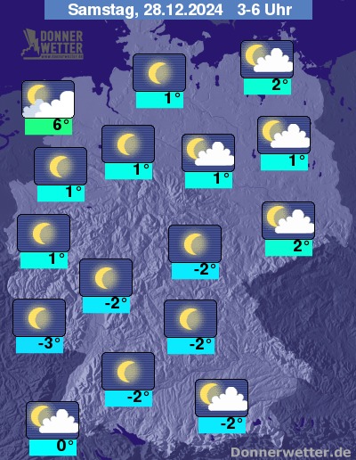 In der Nacht zum Samstag ist der Himmel verbreitet sternenklar, hier und da ziehen lockere Wolkenfelder durch. Im Umfeld der Nordsee können die Wolken auch dicht sein, dazu bleibt es trocken. Die Tiefstwerte liegen bei 6 Grad an der Nordsee und bis -3 Grad am Pfälzer Wald.