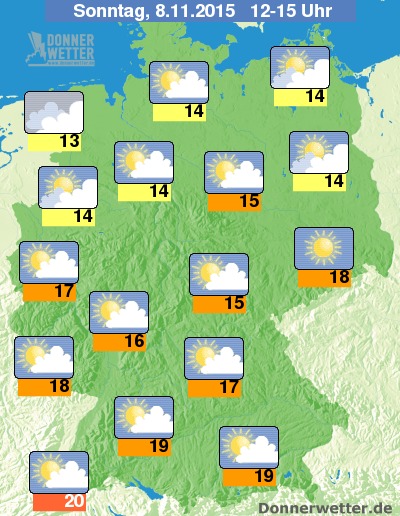Am Nachmittag bestimmt freundliches Hochdruckwetter weite Teile der Republik. Nur an der Nordseeküste können phasenweise auch mal dichtere Wolken durchziehen. Die Temperaturen erreichen Werte um 13 bis 20 Grad C.