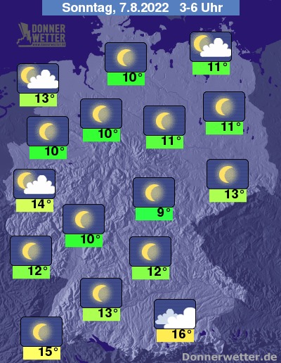 In der folgenden Nacht ist der Himmel über dem Bundesgebiet verbreitet sternenklar oder nur gering bewölkt. Dichte Wolken halten sich über dem Südosten und am Alpenrand, dazu bleibt es trocken. Die Temperatur sinkt auf 16 Grad in München und 9 Grad in Jena.