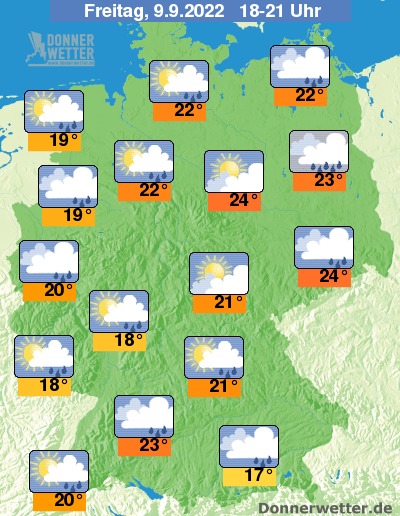Heute Abend zeigt sich über dem Bundesgebiet weiterhin ein Wechsel zwischen Sonnenschein und oft auch dichten Wolken, dabei bilden sich teils kräftige Schauer und örtliche Gewitter. Die Temperatur liegt bei 17 Grad in München und 24 Grad in Magdeburg.