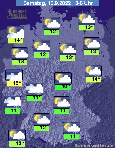 In der Nacht zum Samstag bilden sich über dem Süden und Westen weiterhin gebietsweise Schauer, jedoch kaum noch Gewitter. Im übrigen Bundesgebiet klingen die Schauer bereits vor Mitternacht verbreitet ab und es lockert zumeist auf. Die Temperatur sinkt auf 15 Grad in Köln und etwa 10 Grad in Jena.