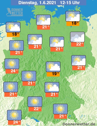 Am Nachmittag zeigt sich der Himmel über der Nord- und Osthälfte wechselnd oder stark bewölkt, bis auf ein geringes Schauer- und Gewitterrisiko im äußersten Osten bleibt es aber meist trocken. Im Süden und Westen scheint die Sonne von einem meist wolkenlosen Himmel oder es ist nur leicht bewölkt.