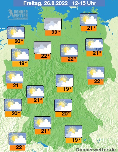 Heute Nachmittag zeigen sich teils Auflockerungen, oft ist es aber auch stark bewölkt, dabei können sich vereinzelt Schauer, ganz lokal auch bereits Gewitter bilden. Die Temperatur liegt bei 19 Grad im Grabfeld und 22 Grad im Breisgau.