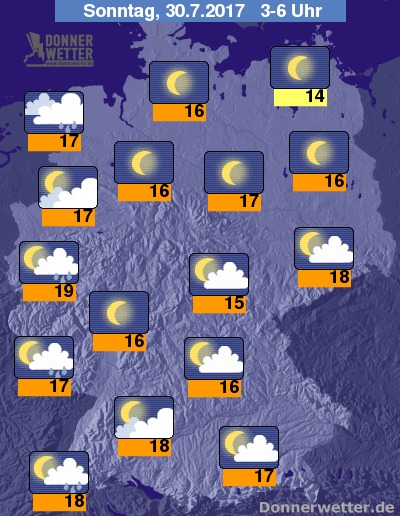 In der kommenden Nacht ist es zunächst verbreitet nur locker bewölkt oder sternenklar. Im Laufe der zweiten Nachthälfte ziehen in den westlichen Landesteilen jedoch zunehmend dichte Wolken auf, die hier einzelne Schauer oder Gewitter mit sich bringen. Im übrigen Bundesgebiet bleibt es trocken bei Tiefstwerten zwischen 19 Grad in Köln und etwa 14 Grad auf Rügen.