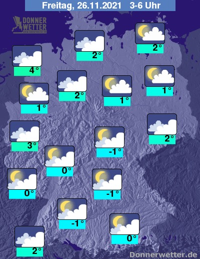 In der Nacht zum Freitag ist der Himmel überwiegend wolkenverhangen, dazwischen kann es jedoch auch mal auflockern. An der Nordsee sind lokale Schauer möglich. Im Alpenvorland setzt im Laufe der zweiten Nachthälfte gebietsweise Schneefall ein. Dabei besteht Glättegefahr! Die Temperatur sinkt auf 4 Grad in Wilhelmshaven und bis -1 Grad in Nürnberg.