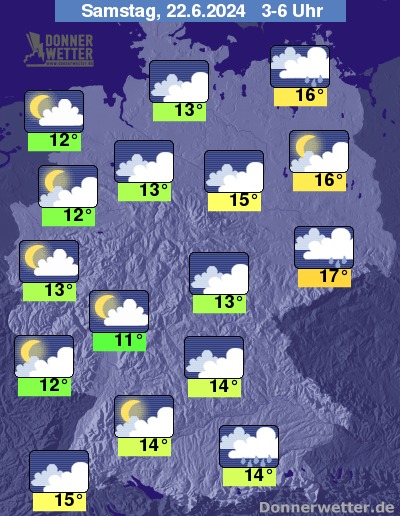 In der Nacht zum Samstag sind im Nordosten und Südosten zunächst noch kräftige Gewitter möglich. In den übrigen Landesteilen sind nur noch loakle Schauer zu erwarten; im Nachtverlauf bleibt es bei gebietsweisen Auflockerungen überwiegend trocken.