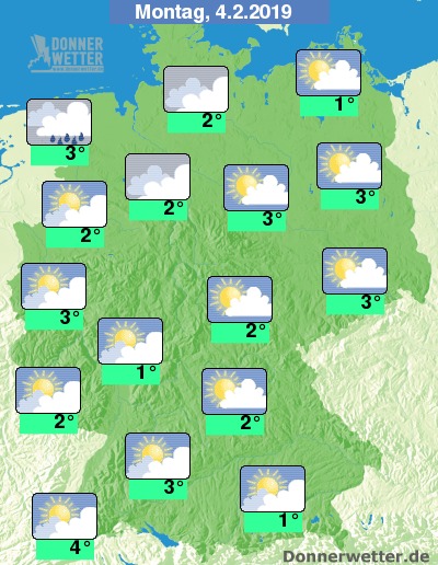 Am Montag ist es zum Teil stark bewölkt, oft erwarten uns aber auch heitere Abschnitte. Nach Westen hin verdichten sich allerdings im Tagesverlauf die Wolken und abends ist auch Schneefall oder Schneeregen möglich, sonst bleibt es hingegen weitgehend trocken. Die Temperatur steigt auf 1 bis 4 Grad.