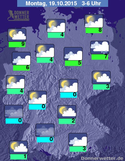 In der bevorstehenden Nacht ziehen im Norden oft dichte Wolken mit gebietsweise auch etwas Regen durch, auch am Alpenrand ist es oft dicht bewölkt und es fällt gebietsweise Regen. In den anderen Landesteilen zieht hingegen größtenteils lockere oder aufgelockerte Bewölkung durch, teils sind aber auch mal dichte Wolken möglich, dabei bleibt es aber trocken. Die Temperatur sinkt auf 9 Grad an der Wesermündung und bis 0 Grad am Bodensee. Stellenweise bildet sich wieder Nebel oder Hochnebel.