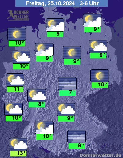 In der Nacht zum Freitag ist der Himmel über dem Land größtenteils locker bewölkt oder sternenklar. Zum Teil etwas mehr und auch mal dichtere Wolken sind sowohl im Norden als auch im Südwesten möglich, aber auch hierbei bleibt es weitgehend trocken. Die Temperatur sinkt auf 13 Grad in Freiburg und etwa 7 Grad in Erfurt.