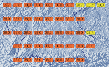 Im Süden Deutschlands bestehen zudem Warnungen vor Hitze / UV-Strahlung. Unser aktuelles Nowcasting berechnet für den Süden aktuell gefühlte Temperaturen um 38 Grad C: