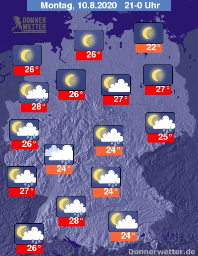 Die Temperaturen bleiben mit Werten um 29 bis 36 Grad schwül-drückend, am späten Abend sinken die Werte dann auf meist 28 bis 24 Grad ab. Am angenehmsten wird es an der Ostseeküste, hier dann um 22 Grad.