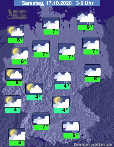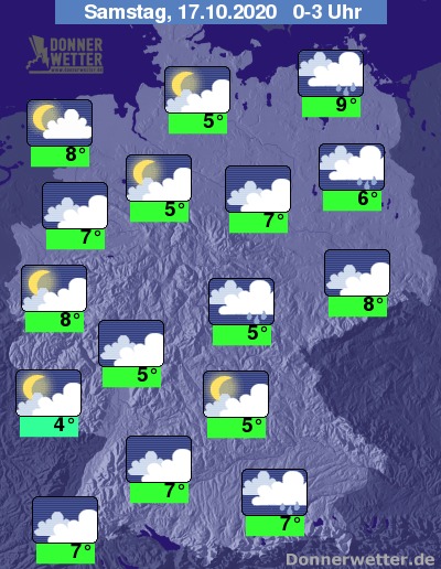 Bis zu den Frühstunden kühlt die Luft auf 9 bis 4 Grad ab, am mildesten bleibt es an der Emsmündung und in der Pommerschen Bucht, besonders an Saar und Mosel kann es leichten Bodenfrost geben.