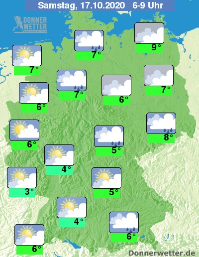 Der Samstag startet über weiten Teilen der Süd- und Westhälfte mit einem Mix aus Sonne und wechselnder Bewölkung; Schauer sind meist nicht zu erwarten. In der Nordosthälfte bleibt die Wolkendecke dagegen zumeist geschlossen und vor allem in den östlichen Mittelgebirgen, entlang der Weser sowie am Alpenrand muss zeitweise mit Schauern gerechnet werden.