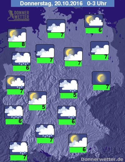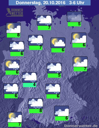 Donnerstag am frühen Morgen ziehen die Wolken im Westen weiter und der Himmel zeigt sich leicht bewölkt. Im Norden und Osten meist bedeckt und an der Ostsee Nebel. Im Süden stark bewölkt. Schauer sind vor allem im Westen und Süden möglich.