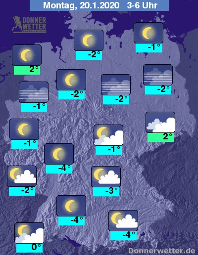 Gebietsweise Nebelbildung, Tiefstwerte um -4 Grad.