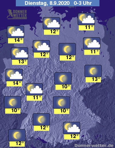 In der Nacht auf Dienstag zeigt sich der Himmel über weiten Landesteilen locker bewölkt, vor allem im Süden und über den südöstlichen Mittelgebirge funkeln die Sterne auch von einem wolkenlosen Himmel. In den frühen Morgenstunden verdichten sich die Wolken im Einzugsgebiet der Nordseeküste, es bleibt zunächst aber noch trocken.