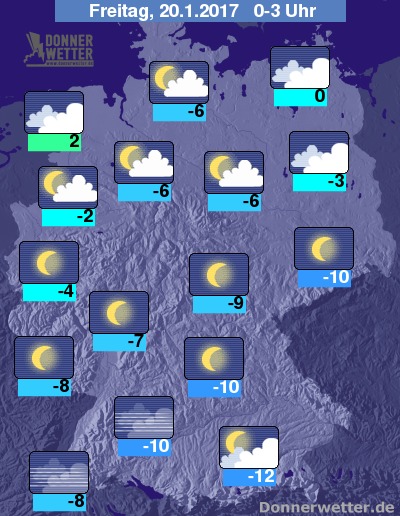 In der Nacht zu Freitag bleibt der Himmel in der Mitte weiterhin klar, im Norden ist es hingegen meist bedeckt, im Süden bildet sich bis zum Morgen vielerorts Nebel. Die Tiefstwerte liegen fast landesweit im Minusbereich. Im Süden sind gar zweistellige Minusgrade zu erwarten.