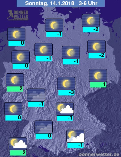 In der Nacht zum Sonntag funkeln über Deutschland verbreitet die Sterne und es ziehen meist nur wenige oder garkeine Wolken durch. Hier und da kann sich Nebel oder Hochnebel bilden. Die Temperatur sinkt auf 2 Grad im Rheinland und bis -3 Grad im Thüringer Becken.