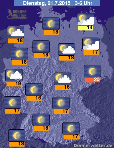 In der Nacht zum Dienstag sind vor allem im Nordosten, gebietsweise aber auch im Westen Deutschlands dichte Wolken unterwegs, die für vereinzelte Schauer sorgen können. Im übrigen Bundesgebiet zeigt sich der Himmel jedoch sternenklar oder nur leicht bewölkt und es bleibt trocken. Die Temperatur sinkt auf 20 Grad in Dresden und bis 14 Grad in Vorpommern.