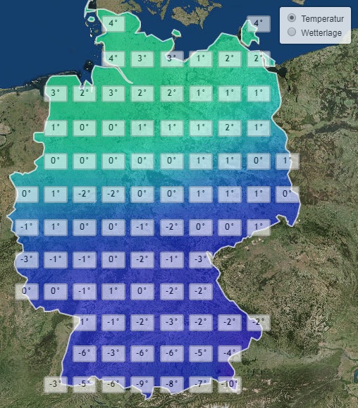 Die Temperaturen zeigen dabei in den Morgenstunden ein klares Nord-Süd-Gefälle. Während es an der Nordsee bei Tiefstwerten um die 4 Grad vergleichsweise mild bleibt, wird die Nacht in den Tälern im Süden mit bis zu -10 Grad äußerst frostig.