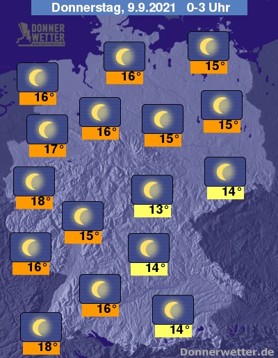 Die Temperaturen gehen in der Nacht auf Werte um 17 Grad im Breisgau und teils 12 Grad in Thüringen zurück.